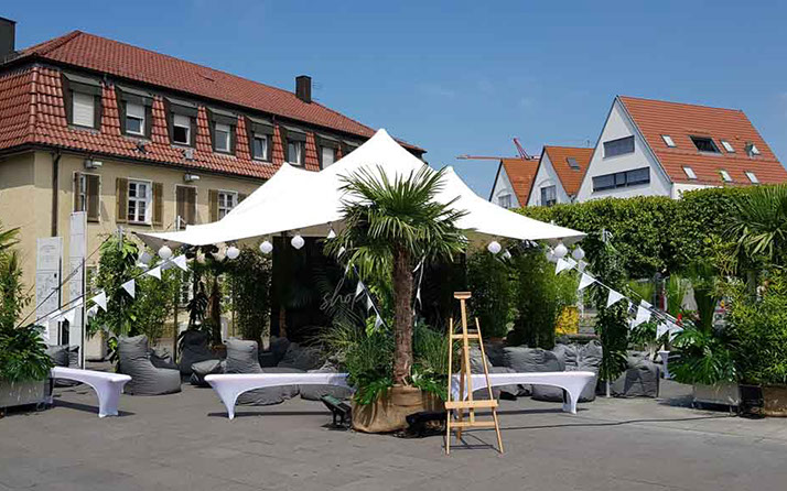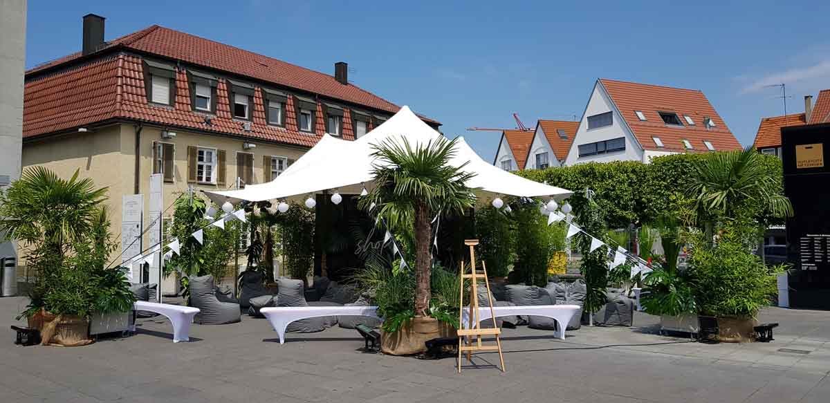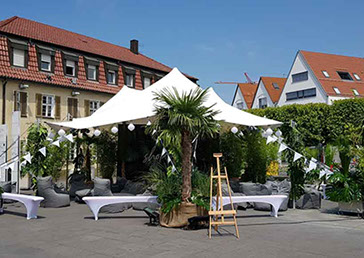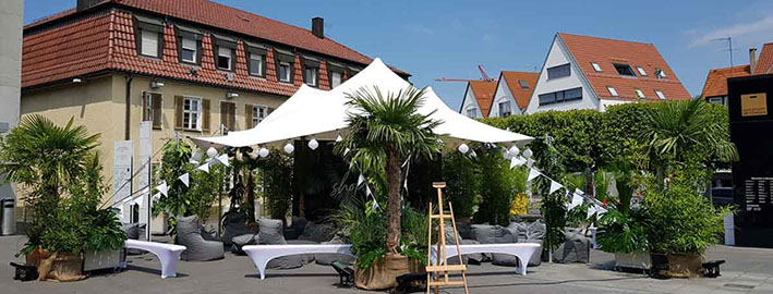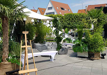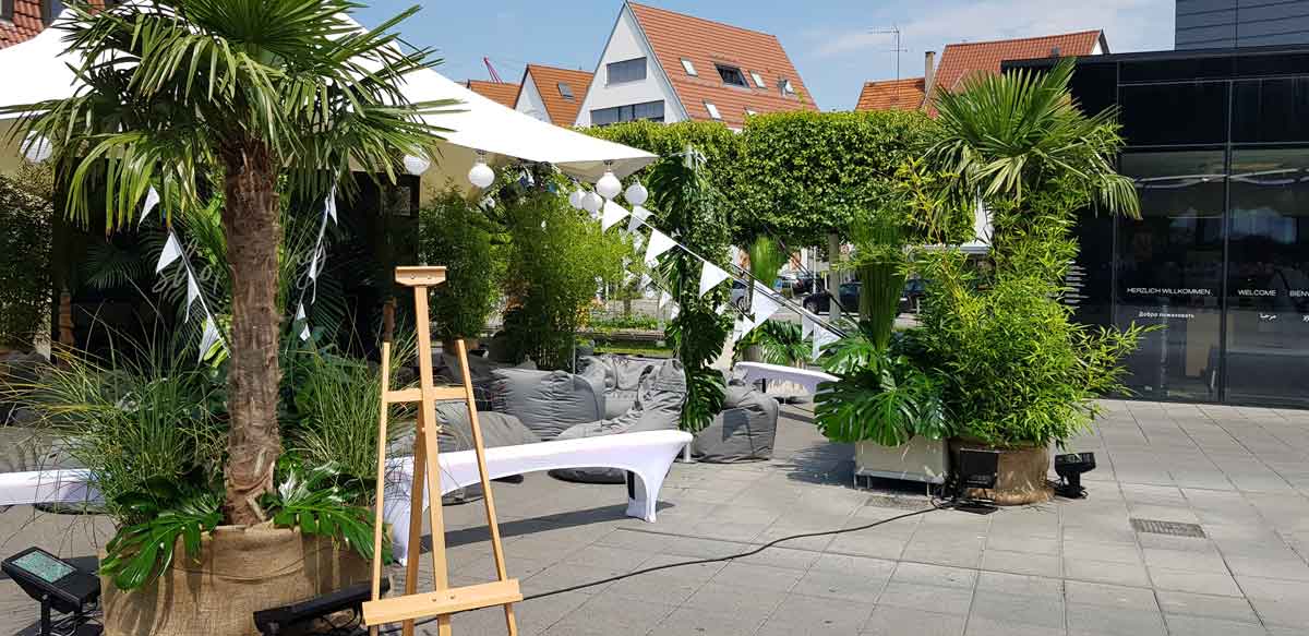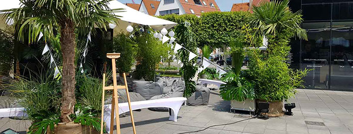 Egal ob Festzelt oder Betriebsfeier, wir gestalten Ihr großes Event mit dekorativem Pflanzenschmuck. Von der großen Palme, bis hin zu einem Tannenzweigen-Dach für Ihren Messestand, wir beliefern Sie mit der zu Ihrem Event passenden Pflanzendekoration.